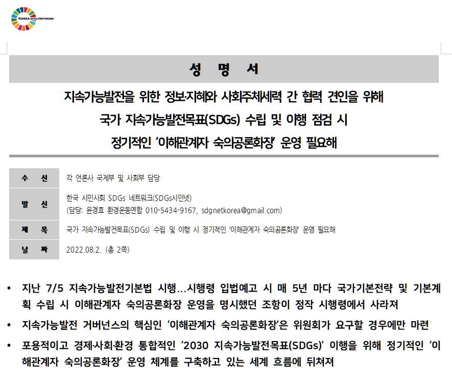 | [성명서] 제5차 지속가능발전 국가기본전략 수립 이해관계자 참여 숙의공론장 운영 촉구 (0) | 2025.09.23 |
