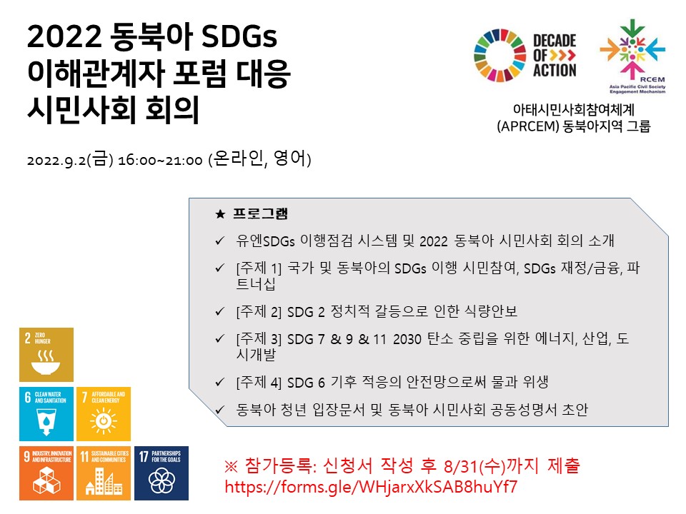 동북아 지역의 유엔SDGs 이행 현황을 시민사회그룹의 비판적 관점으로 검토하여, 각 국의 지속가능발전 목표 이행을 촉진하고, 동북아 시민사회 공동 목소리를 모아내기 위한 자리입니다.