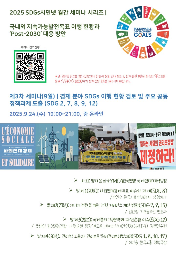 | 제 4차 세미나 | 사회 분야 SDGs 이행 현황과 과제(SDG 1, 3, 4, 5, 10, 11)_10/29(수) 19:00 (0) | 2025.10.13 |