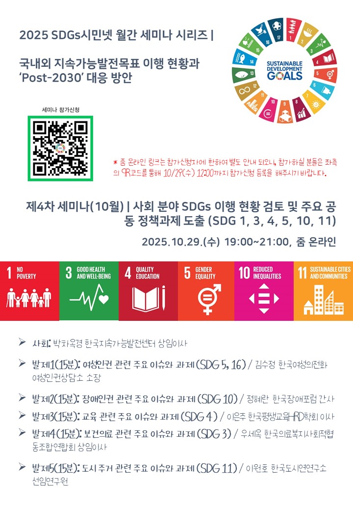 | 제6차 세미나 | 평화/제도/협력/재원/데이터 분야(SDG 16, 17)_12/23(화), 19:00 (0) | 2025.11.27 |