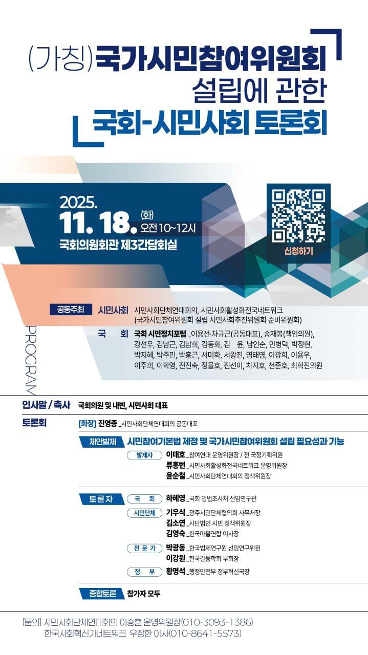 - 문의처: 시민사회단체연대회의(이승훈 운영위원장 010-3093-1386), 한국사회혁신가네트워크(우장한 이사 010-8641-5573)