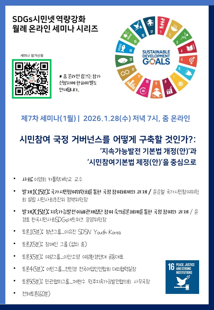 이번 자리는 새롭게 발의된 시민참여기본법이 지향하는 시민참여 체계와, SDGs시민넷이 축적해 온 이해관계집단 참여 숙의공론 모델의 차이와 공통점을 살펴보고, 두 체계가 상호 보완적으로 결합되어 국정 운영과 지속가능발전 거버넌스를 강화하기 위한 입법적·행정적·운동적 과제를 함께 논의하고자 마련되었습니다.
