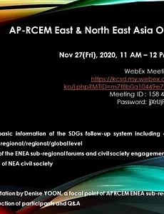 English Info23 [2021 NEA CSO Forum] Youtube Live TV_Oct 22(Fri) 14:00 Youtube Live TV Link: https://youtu.be/aiQi2Mf82EU Program Opening Session: Introduction of UN's SDGs follow-up process and CSO engagement mechanism, Youth Statement, Card Message Relay Performance of All Participants Session 1 | Review of the CSO engagement mechanism at sub-national, national and sub-regional level: Sharing 4 National Practices and Issues (Japan, Korea, Mongolia, Russia) Sessio.. 2021. 10. 19. [NEA SDGs Forum] The 2021 NEA CSO Session will take place on Oct 22(Fri) Responding to the 2021 North-East Asia Multi-stakeholder Forum on SDGs on Oct 28-29, the CSO session is organized to provide a space for NEA CSOs to share their stories and voices about the agenda of the 2022 HLPF before the NEA SDGs Forum and prepare its collective voice submitting to the UN at the sub-regional and regional level. The aim of the CSO session is: Making an NEA CSO position paper .. 2021. 10. 5. [2021 NEA SDGs Forum] UN's sub-regional preparatory process for the 2022 HLPF will take place on Oct 28-29 virtually Building back better from COVID-19 while advancing the full implementation of the 2030 Agenda ESCAP East and North-East Asia Office will virtually organize the annual North-East Asian Multistakeholder Forum on SDGs on 28 and 29 October 2021. As a part of the preparatory process for the 9th Asia-Pacific Forum on Sustainable Development (APFSD) and the 2022 High-level Political Forum on Sustainabl.. 2021. 10. 5. Korean CSOs Report of SDGs Progress in Korea 2021 Copyright ⓒ 2021 Korea SDGs Network. All Right Reserved. Title | Korean CSOs Report of SDGs Progress in Korea 2021: Economic and social recovery for inclusiveness and carbon Neutrality after Covid-19_English Summary Published by Korea SDGs Network(Secretariat: The Korea Center for Sustainable Development(KCSD)) Issued on July 2021 Publishing House | The Korea Center for Sustainable Development(K.. 2021. 7. 26. 2020 Asia Pacific People's Forum_Nov 26~30 Attached is the concept note of the program: tinyurl.com/AsPacPeoplesForum2020Concept If you have any concerns/inquiries, please contact or ★ ENEA Sub-regional Constituency Workshop in the People's Forum_Nov 27(Fri) Webex Meeting Link for the ENEA Orientation WorkshopMeeting ID: 158 423 8253Password: jjXrUjPB832 For inquiries, please contact to: Denise YOON, Focal Point of the ENEA sub-regional .. 2020. 11. 25. 이전 1 2 3 4 5 다음