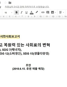 안녕하세요, SDGs시민넷은 작년 첫번째 유엔 제출에 이어, 올해 두번째 를 작성해, 우리의 시민사회 이슈를 기록하고 학습하는 과정으로 삼는 동시에, 유엔에 제출하여 '포용적이고 통합적이며 참여적인 국가 SDGs 이행체계 구축'하는 정책운동 수단으로 활용하고자 합니다. 2018.5.8(화)~6.1(금)까지 총 26일 동안 온라인상으로 의견 수렴을 진행할 예정입니다. 올해 점검 주제인 SDG 6(물/위생), SDG 7(에너지), SDG 11(도시), SDG 12(소비생산-자원순환, 사회적경제), SDG 15(육상생태계)와 범분야 이슈인 성평등, 장애인, 청년 등 총 8개 주제 파트로 구성되어 있으며, 이중, 현재, SDG 6(물/위생), SDG 12(소비생산-사회적경제), SDG 15(육상생태계) 등 총 ..