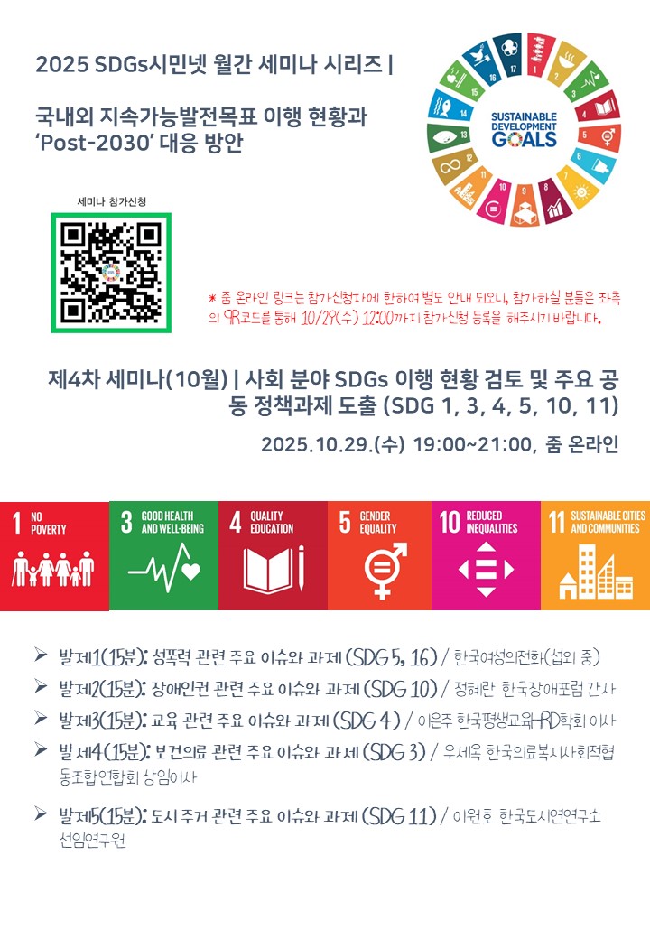 제 4차 세미나 | 사회 분야 SDGs 이행 현황과 과제(SDG 1, 3, 4, 5, 10, 11)_10/29(수) 19:00